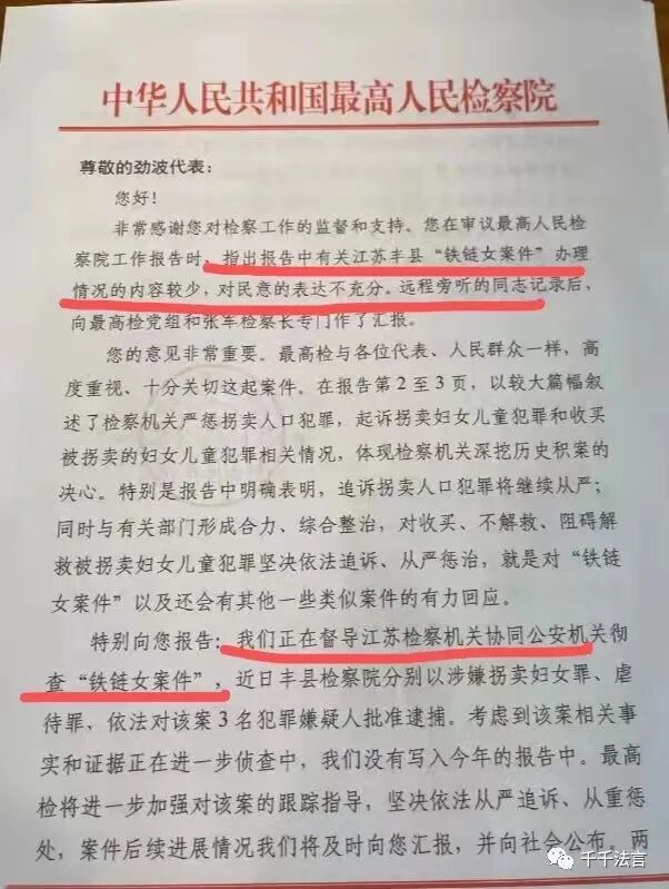 最高检的回函明确表示:我们正在督导江苏检察机关协同公安机关彻查“铁链女案件”。近日丰县检察院分别以涉嫌拐卖妇女罪、虐待罪,依法对该案3名犯罪嫌疑人批准逮捕。考虑到该案相关事实和证据正在进一步侦查中,我们没有写入今年的报告中。最高检将进一步加强对该案的跟踪指导,坚决依法从严追诉、从重惩处,案件后续进展情况我们将及时向您汇报,并向社会公布。